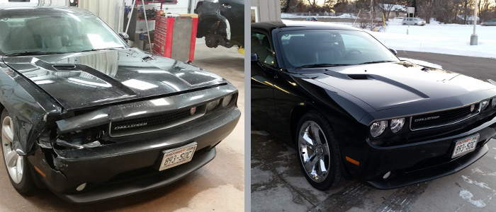 This Dodge Challenger suffered collision damage to the front right corner. We replaced the accident damaged parts and were able to refinish the hood, fender and bumper in our autobody shop using our precision color matching and paint mixing technology.
