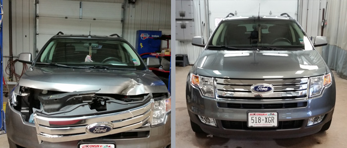 This Ford Edge suffered deer collision damage to the hood, headlight, grill & AC condenser. We replaced the damaged parts and recharged the air conditioning system with our in-house AC servicing equipment.