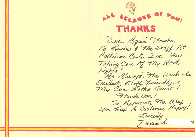 To Kevin & The Staff at Collision Center Inc. for takin care of my head lights! "As always" the work is excellent, staff friendly & my car looks great!